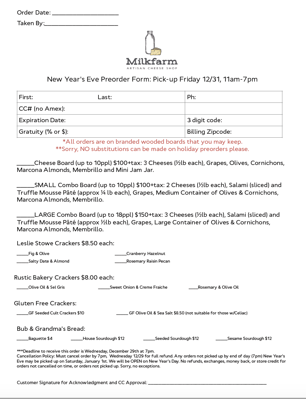 Cancellation Policy: Must cancel order by 7pm, Wednesday 12/29 for full refund. Any orders not picked up by end of day (7pm) New Year’s